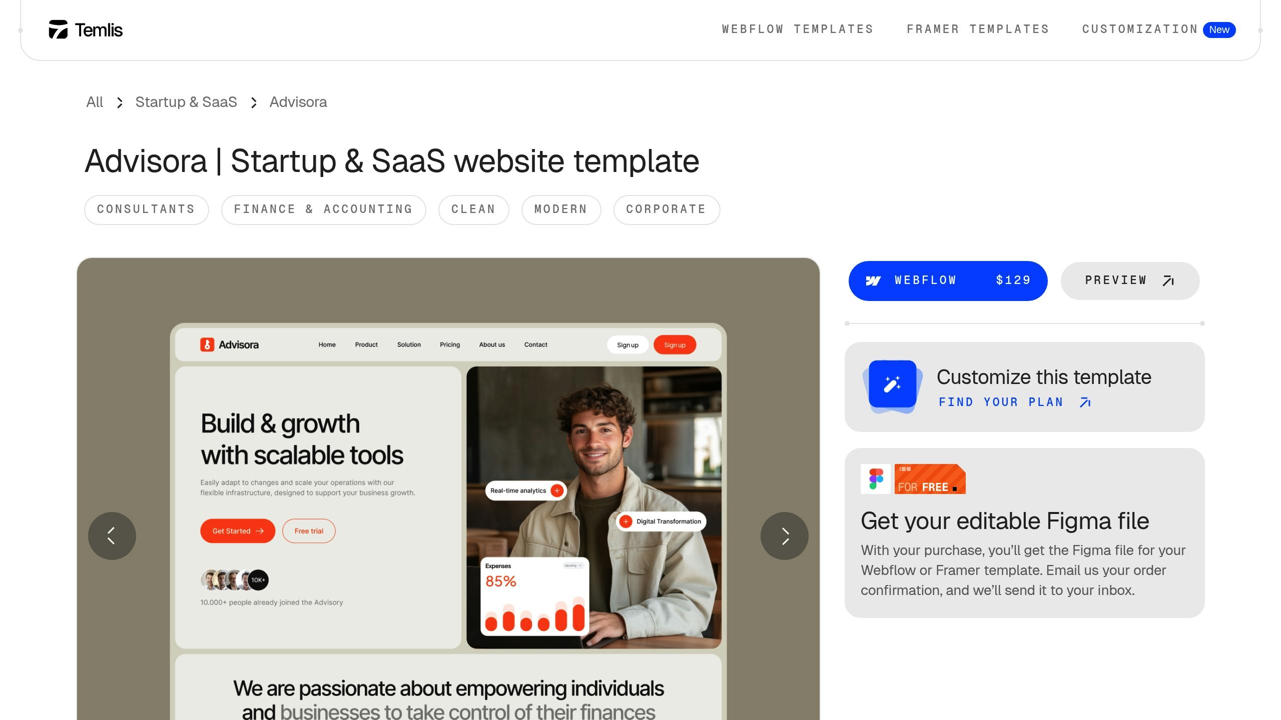 Advisora, priced at $129, stands out with its extensive features tailored for finance and SaaS businesses. The other templates, priced at $79, focus on specific industries and provide targeted tools. All templates come with reliable customer support to assist with setup and customization.
