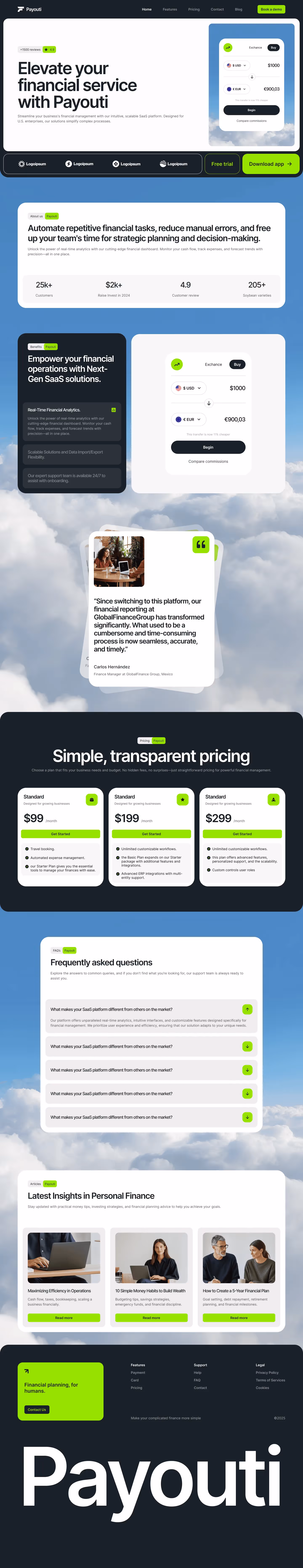 Payouti is a professional Webflow template crafted for finance startups, SaaS platforms, and mobile applications. Its clean and scalable structure makes it easy to showcase your product, highlight app features, display pricing plans, and build trust through testimonials.